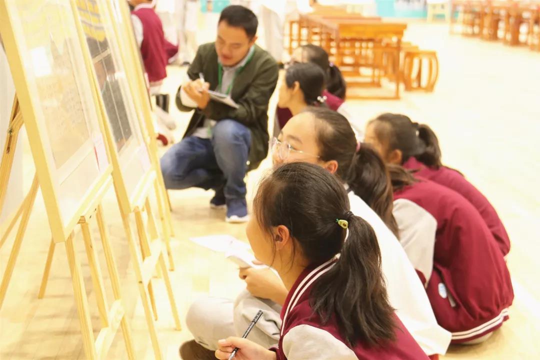 參展的一百多幅書法作品,仿佛被賦予了生命。孩子們分組觀摩書法作品,他們用心體會著書法里蘊含的詩歌、繪畫、舞蹈和音樂,在濃厚的墨香氛圍中,感受著傳統文化的無邊魅力。